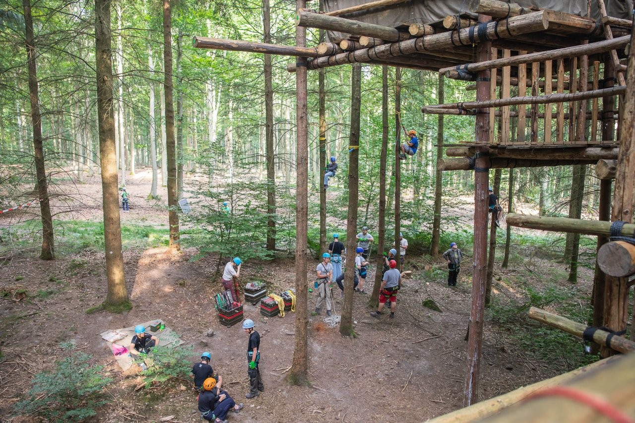 Baumhauscamp bedeutet aber auch Bauen. Der zweite Hauptfokus neben unserem geistlichen Thema liegt natürlich auf dem Bauen. Da hatten wir uns dieses Jahr einiges vorgenommen: Zu den bereits vorhandenen fünf Plattformen plus Steg kamen noch einmal vier Plattformen, ein weiterer Steg, unsere allererste Netzplattform sowie eine geniale Rutsche dazu. Darauf können wir echt stolz sein! Es ist jedes Jahr am Ende des Camps beeindruckend zu sehen, wie viel wir in dieser kurzen Zeit geschafft haben. Natürlich war es anstrengend, natürlich haben wir geschwitzt, und manchmal hatte man auch keine Lust auf den zehnten Bund in Folge. Aber jeder hat für den Erfolg des Teams mitgearbeitet. Die Jugendlichen hatten die Chance, ihre Komfortzone zu verlassen und über sich hinauszuwachsen. Der eine hat vielleicht seine Höhenangst überwunden, der andere hatte das erste Mal Hammer und Nagel in der Hand, wieder ein anderer hat zum ersten Mal jemanden gesichert. Im Baumhauscamp bekommt jeder die Chance, über sich hinauszuwachsen.
