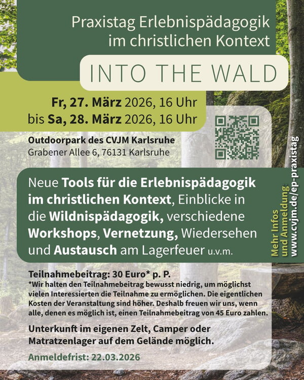 • Wildnispädagogik – Lass dich von den Abenteuern in der Natur inspirieren und entdecke, wie gemeinschaftliche Aktivitäten und handwerkliche Techniken deine Kreativität entfalten können. Gemeinsam denken wir darüber nach, was wir als christliche Erlebnispädagog:innen von der Wildnispädagogik lernen können.